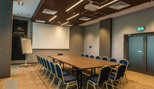 Innym ważnym zadaniem było wyposażenie sal konferencyjnych. Największa z sal mieści do 86 osób w ułożeniu teatralnym, ale można ją zaaranżować dowolnie, zgodnie z oczekiwaniami Gościa. Sala jest wyposażona w ścianę przesuwną, która umożliwia podzielenie jej na dwie mniejsze – jedną z 52 miejscami, drugą – z 22 miejscami w ułożeniu teatralnym lub innym. Zaletą tej sali jest tak pożądana przez organizatorów konferencji dostępność do światła dziennego, co zapewniają duże przeszklenia. Z kolei elektronicznie sterowane rolety pozwalają automatycznie regulować stopień zaciemnienia sali, więc dogodnie można w niej przeprowadzić projekcje multimedialne.